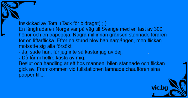 En långtradare i Norge var på väg till Sverige med en last av 300 hönor och en papegoja. Några mil innan gränsen stannade föraren för en liftarflicka. Efter en stund blev han närgången, men flickan motsatte sig alla försökt.