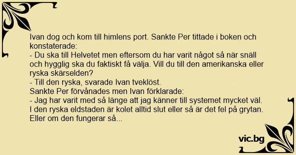 Ivan dog och kom till himlens port. Sankte Per tittade i boken och konstaterade: