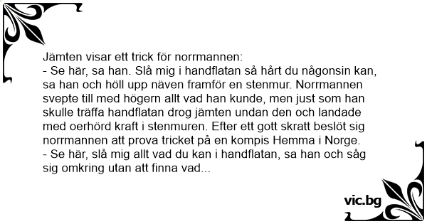 - Se här, sa han. Slå mig i handflatan så hårt du någonsin kan, sa han och höll upp näven framför en stenmur. Norrmannen svepte till med högern allt vad han kunde, men just som han skulle träffa handflatan drog jämten undan den och landade med oerhörd kraft i stenmuren. Efter ett gott skratt beslöt sig norrmannen att prova tricket på en kompis Hemma i Norge.
