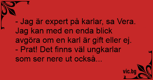 - Jag är expert på karlar, sa Vera. Jag kan med en enda blick avgöra om en karl är gift eller ej.