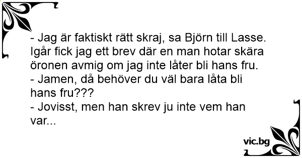 - Jag är faktiskt rätt skraj, sa Björn till Lasse. Igår fiск jag ett brev där en man hotar skära öronen avmig om jag inte låter bli hans fru.