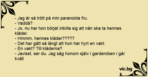 Mannen i var orolig för sin fru och konsulterade en psykiater: – Hon lider av an fobi, hon tror att alla hennes kläder kommer att bli stulna. Nu senast när jag kom hem, hade hon hyrt en man stod...