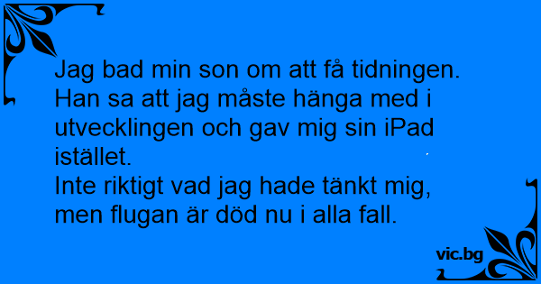Wife asked her husband to give her the newspaper. Husband: "How backward you are? Technology has developed so much and you are still asking for the newspaper... Take my iPad..." Wife took the iPad and killed the Cockroach. Husband faints. Moral: Whatever the wife asks, give her without argument....