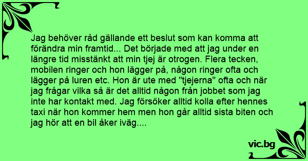 Jag behöver råd gällande ett beslut som kan komma att förändra min framtid... Det började med att jag under en längre tid misstänkt att min tjej är otrogen. Flera tecken, mobilen ringer och hon lägger på, någon ringer ofta och lägger på luren etc. Hon är ute med "tjejerna" ofta och när jag frågar vilka så är det alltid någon från jobbet som jag inte har kontakt med. Jag försöker alltid kolla efter hennes taxi när hon kommer hem men hon går alltid sista biten och jag hör att en bil åker iväg. Det kanske inte är en taxi? För ett par dagar sen plockade jag upp hennes mobil bara för att se vad klockan var och då blev hon helt tokig. Hon skrek att jag skulle ge fаn i hennes mobil och att jag snokade. Hursomhelst så har jag inte konfronterat henne än. Jag tror att innerst inne så vill jag inte veta sanningen. Men igår kväll så bestämde jag mig för att kolla upp henne. Jag bestämde mig för att gömma mig bakom min bil för att få en blick över hela gatan och se vilken bil hon kom ut ur. Det var medans jag hukade mig bakom bilen som jag såg att jag hade rost i hela bakre hjulhuset. Tycker ni att jag ska lämna in bilen på en verkstad eller köpa lite prylar på mekonomen och fixa det själv?