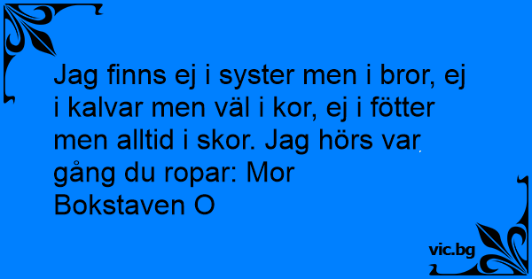 Jag finns ej i syster men i bror, ej i kalvar men väl i kor, ej i fötter men alltid i skor. Jag hörs var gång du ropar: Mor