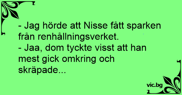 - Jag hörde att Nisse fått sparken från renhållningsverket.