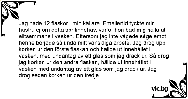 Jag hade 12 flaskor i min källare. Emellertid tyckte min hustru ej om detta spritinnehav, varför hon bad mig hälla ut alltsammans i vasken. Eftersom jag inte vågade säga emot henne började sålunda mitt vanskliga arbete. Jag drog upp korken ur den första flaskan och hällde ut innehållet i vasken, med undantag av ett glas som jag drack ur. Så drog jag korken ur den andra flaskan, hällde ut innehållet i vasken med undantag av ett glas som jag drack ur. Jag drog sedan korken ur den tredje flaskan, hällde ut ett glas med undantag av det innehåll som jag drack ur. Så drog jag korken ur den fjärde vasken, hällde flaskan i glaset, som jag drack ur. Sedan drog jag upp korken ur det nästa glaset, hällde korken i flaskan och drog ur glaset. Därefter drog jag korken ur flaskan, hällde vasken i flaskan och satte korken i flaskan med glaset och hällde whiskeyn på flaskan. Då alla flaskor voro tomma, stödde jag huset med ena handen medan jag räknade flaskor, korkar och glas med den andra. Det blev 29 precis. För att vara riktigt säker på min sak räknade jag en gång till. Den gången blev det 74 igen. Då huset passerade förbi räknade jag det hela om igen och till sist alla husen, flaskorna samt vaskarna med undantag av en kork, som jag hällde i huset och drack ur.