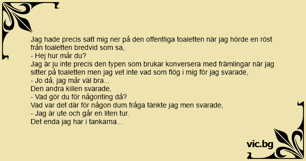 Jag är ju inte precis den typen som brukar konversera med främlingar när jag sitter på toaletten men jag vet inte vad som flög i mig för jag svarade,