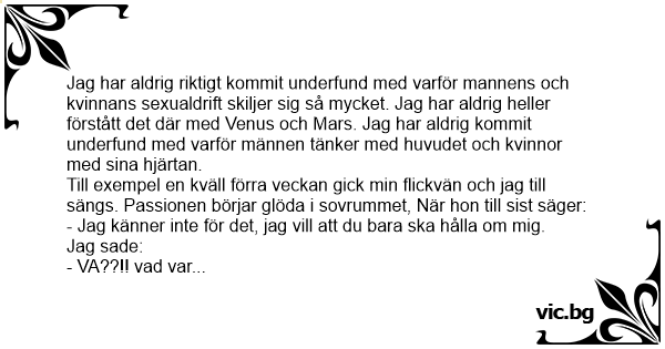 Jag har aldrig riktigt kommit underfund med varför mannens och kvinnans sexualdrift skiljer sig så mycket. Jag har aldrig heller förstått det där med Venus och Mars. Jag har aldrig kommit underfund med varför männen tänker med huvudet och kvinnor med sina hjärtan.