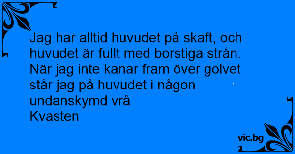 Jag har alltid huvudet på skaft, och huvudet är fullt med borstiga strån. När jag inte kanar fram över golvet står jag på huvudet i någon undanskymd vrå