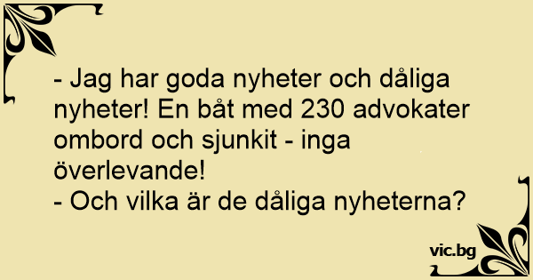 - Jag har goda nyheter och dåliga nyheter! En båt med 230 advokater ombord och sjunkit - inga överlevande!