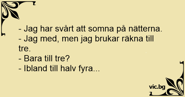 - Как заспивате? Аз броя до 3 и заспивам, а понякога и до 5 без 15. "Doktor, ich habe Einschlafschwierigkeiten, was soll ich nur tun?" — Больной, а как вы засыпаете? Ein Mann bestellt nun schon den 10. Kaffee. Fragt der Kellner: "Haben sie eigentlich nie Probleme mit dem Einschlafen, wenn sie soviel Kaffee trinken?" Mann: "Ach, mit dem Einschlafen ist das immer so: Ich zähle bis drei, und dann schlaf ich meistens." Kellner: "Sie zählen bis drei?" Mann: "Naja... — Хворий, а як ви засинаєте? — Добре. Рахую до трьох і засинаю. — Як, тільки до трьох?! — Ну, иноді до пів четвертої. "Ich schlafe abends sehr schlecht ein." "Kenne ich. Ich zähle dann immer bis drei." "Ach, und das hilft?" "Na ja, manchmal zähle ich auch bis halb vier ..."
