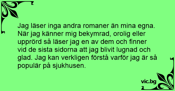 Jag läser inga andra romaner än mina egna. När jag känner mig bekymrad, orolig eller upprörd så läser jag en av dem och finner vid de sista sidorna att jag blivit lugnad och glad. Jag kan verkligen förstå varför jag är så populär på sjukhusen.