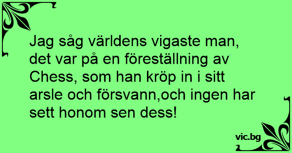 Jag såg världens vigaste man, det var på en föreställning av Chess, som han kröp in i sitt arsle och försvann,och ingen har sett honom sen dess!