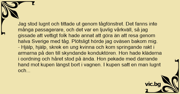 - Hjälp, hjälp, skrek en ung kvinna och kom springande rakt i armarna på den till skyndande konduktören. Hon hade kläderna i oordning och håret stod på ända. Hon pekade med darrande hand mot kupen längst bort i vagnen. I kupen satt en man lugnt och rökte på en cigarr, vid sin fönsterplats.