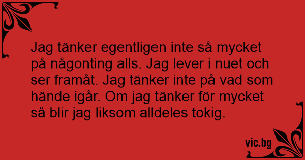 Jag tänker egentligen inte så mycket på någonting alls. Jag lever i nuet och ser framåt. Jag tänker inte på vad som hände igår. Om jag tänker för mycket så blir jag liksom alldeles tokig.
