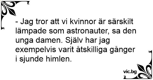 - Jag tror att vi kvinnor är särskilt lämpade som astronauter, sa den unga damen. Själv har jag exempelvis varit åtskilliga gånger i sjunde himlen.