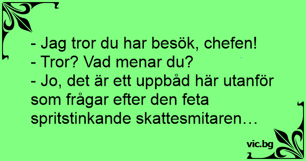 - Jo, det är ett uppbåd här utanför som frågar efter den feta spritstinkande skattesmitaren…