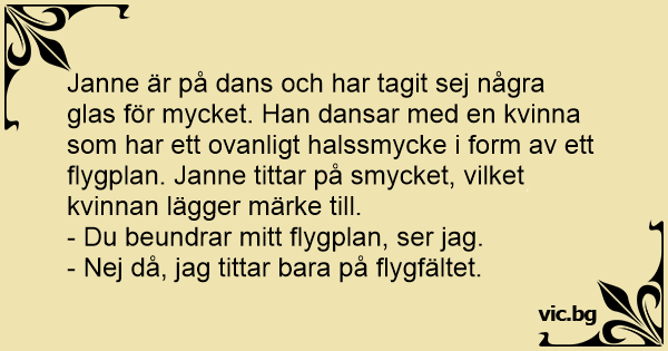 Janne är på dans och har tagit sej några glas för mycket. Han dansar med en kvinna som har ett ovanligt halssmycke i form av ett flygplan. Janne tittar på smycket, vilket kvinnan lägger märke till.
