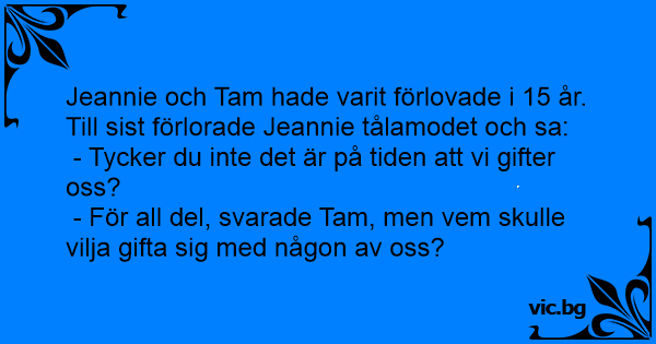 Jeannie och Tam hade varit förlovade i 15 år. Till sist förlorade Jeannie tålamodet och sa: