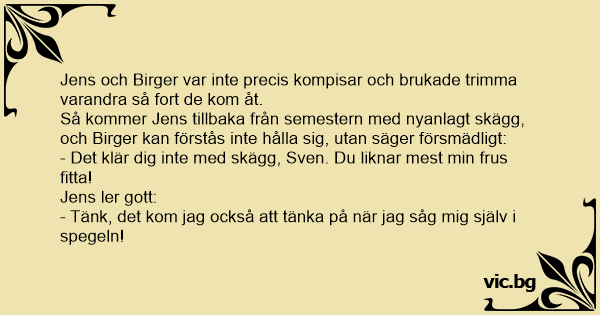 - Det klär dig inte med skägg, Sven. Du liknar mest min frus fiтта!