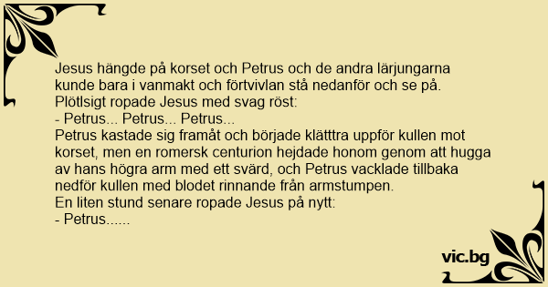 Jesus hängde på korset och Petrus och de andra lärjungarna kunde bara i vanmakt och förtvivlan stå nedanför och se på. Plötlsigt ropade Jesus med svag röst: