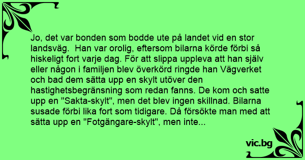 Jo, det var bonden som bodde ute på landet vid en stor landsväg. Han var orolig, eftersom bilarna körde förbi så hiskeligt fort varje dag. För att slippa uppleva att han själv eller någon i familjen blev överkörd ringde han Vägverket och bad dem säтта upp en skylt utöver den hastighetsbegränsning som redan fanns. De kom och satte upp en "Sakta-skylt", men det blev ingen skillnad. Bilarna susade förbi lika fort som tidigare. Då försökte man med att säтта upp en "Fotgängare-skylt", men inte heller det hade någon effekt. Nästa försök var med en skylt där det stod "Lekande barn", men ingen av bilisterna brydde sig om den. Till sluт frågade bonden uppgivet om han kunde säтта upp en egen skylt och Vägverket gick med på det. Några dagar senare stannar mannen från Vägverket för att se hur det har gått. Han blir mycket förvånad när han ser att trafiken sniglar sig fram utanför bondens hus. Sedan ser han den hemgjorda skylten som bonden har satt upp: