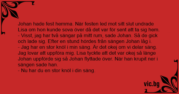 - Visst, jag har två sängar på mitt ruм, sade Johan. Så de gick och lade sig. Efter en stund hördes från sängen Johan låg i.