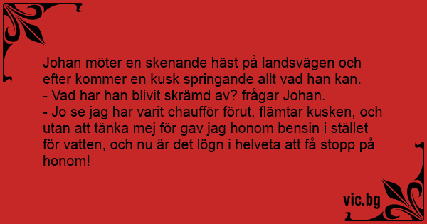 - Jo se jag har varit chaufför förut, flämtar kusken, och utan att tänka mej för gav jag honom bensin i stället för vatten, och nu är det lögn i helveta att få stopp på honom!