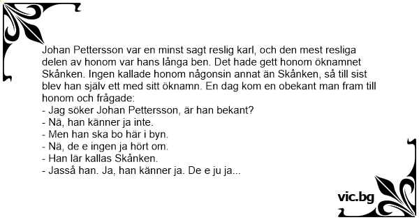 Johan Pettersson var en minst sagt reslig karl, och den mest resliga delen av honom var hans långa ben. Det hade gett honom öknamnet Skånken. Ingen kallade honom någonsin annat än Skånken, så till sist blev han själv ett med sitt öknamn. En dag kom en obekant man fram till honom och frågade:
