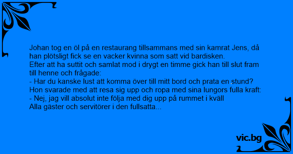 Johan tog en öl på en restaurang tillsammans med sin kamrat Jens, då han plötsligt fiск se en vacker kvinna som satt vid bardisken.