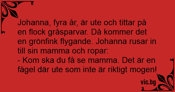 Johanna, fyra år, är ute och tittar på en flock gråsparvar. Då kommer det en grönfink flygande. Johanna rusar in till sin mamma och ropar: