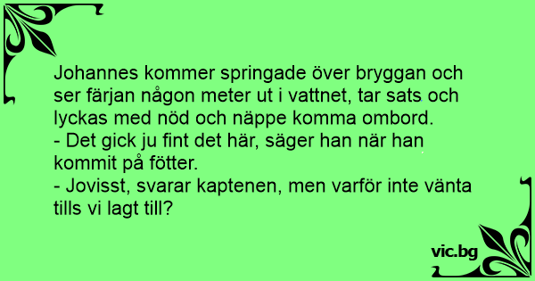 Johannes kommer springade över bryggan och ser färjan någon meter ut i vattnet, tar sats och lyckas med nöd och näppe komma ombord.