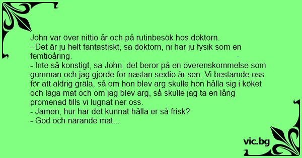 - Inte så konstigt, sa John, det beror på en överenskommelse som gumman och jag gjorde för nästan sextio år sen. Vi bestämde oss för att aldrig gräla, så om hon blev arg skulle hon hålla sig i köket och laga mat och om jag blev arg, så skulle jag ta en lång promenad tills vi lugnat ner oss.