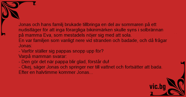 Jonas och hans familj brukade tillbringa en del av sommaren på ett nudistläger för att inga förargliga bikinimärken skulle syns i solbrännan på mamma Eva, som mestadels nöjer sig med att sola. En var familjen som vanligt nere vid stranden och badade, och då frågar Jonas: - Varför ställer sig pappas snopp upp för? Varpå mamman svarar: - Den gör det när pappa blir glad, förstår du! - Okej, säger Jonas och springer ner till vattnet och fortsätter att bada. Efter en halvtimme kommer Jonas upp och säger: - Pappa står och pratar med en jättesnygg tjej och han blir bara gladare och gladare ju mer han pratar med henne...