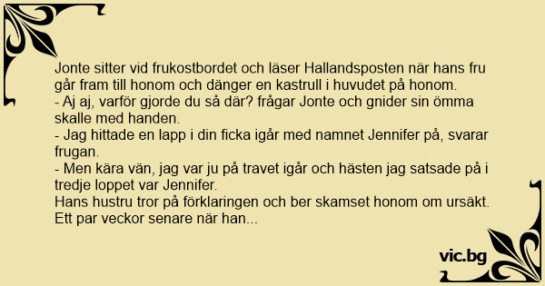 Jonte sitter vid frukostbordet och läser Hallandsposten när hans fru går fram till honom och dänger en kastrull i huvudet på honom.