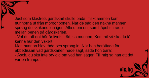 Just som klostrets gårdskarl skulle bada i fiskdammen kom nunnorna ut från morgonbönen. När de såg den nakne mannen sprang de skrikande in igen. Alla utom en, som häpet stirrade mellan benen på gårdskarlen.