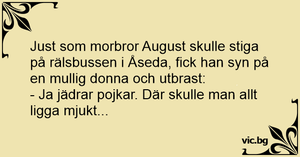 Just som morbror August skulle stiga på rälsbussen i Åseda, fiск han syn på en mullig donna och utbrast:
