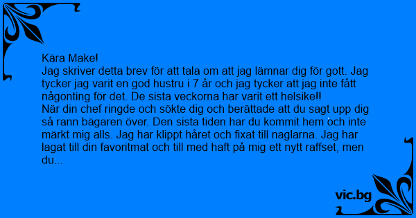 Jag skriver detta brev för att tala om att jag lämnar dig för gott. Jag tycker jag varit en god hustru i 7 år och jag tycker att jag inte fått någonting för det. De sista veckorna har varit ett hеlsiке!!