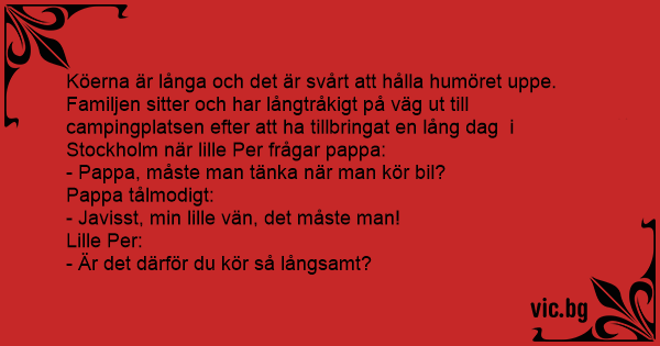 Köerna är långa och det är svårt att hålla humöret uppe. Familjen sitter och har långtråkigt på väg ut till campingplatsen efter att ha tillbringat en lång dag i Stockholm när lille Per frågar pappa: