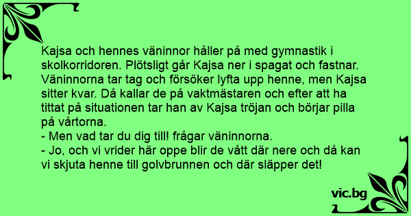 Kajsa och hennes väninnor håller på med gymnastik i skolkorridoren. Plötsligt går Kajsa ner i spagat och fastnar. Väninnorna tar tag och försöker lyfta upp henne, men Kajsa sitter kvar. Då kallar de på vaktmästaren och efter att ha tittat på situationen tar han av Kajsa tröjan och börjar pilla på vårtorna.