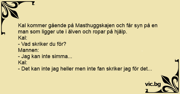Kal kommer gående på Masthuggskajen och får syn på en man som liggеr ute i älven och ropar på hjälp.