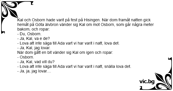 Kal och Osborn hade varit på fest på Hisingen. När dom framåt natten gick hemåt på Göta älvbron vänder sig Kal om mot Osborn, som går några meter bakom, och ropar: