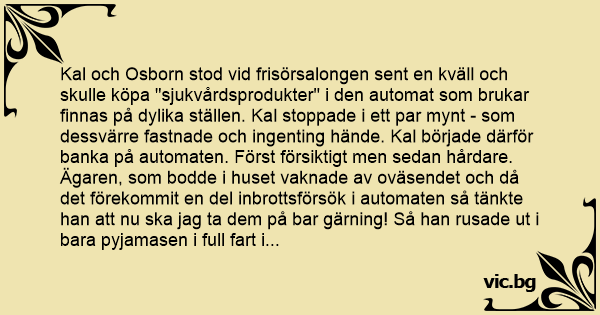Kal och Osborn stod vid frisörsalongen sent en kväll och skulle köpa "sjukvårdsprodukter" i den automat som brukar finnas på dylika ställen. Kal stoppade i ett par mynt - som dessvärre fastnade och ingenting hände. Kal började därför banka på automaten. Först försiktigt men sedan hårdare. Ägaren, som bodde i huset vaknade av oväsendet och då det förekommit en del inbrottsförsök i automaten så tänkte han att nu ska jag ta dem på bar gärning! Så han rusade ut i bara pyjamasen i full fаrт i riktning mot automaten. Osborn såg honom komma ångande så han stötte i Kal och sa: