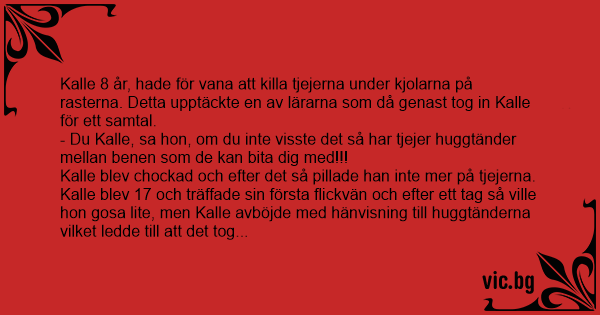 - Du Kalle, sa hon, om du inte visste det så har tjejer huggtänder mellan benen som de kan bita dig med!!!