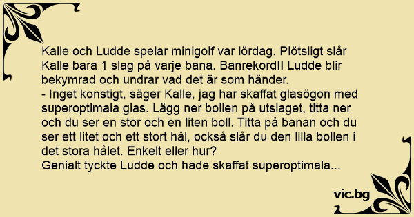 - Inget konstigt, säger Kalle, jag har skaffat glasögon med superoptimala glas. Lägg ner bollen på utslaget, titta ner och du ser en stor och en liten boll. Titta på banan och du ser ett litet och ett stort hål, också slår du den lilla bollen i det stora hålet. Enkelt eller hur?