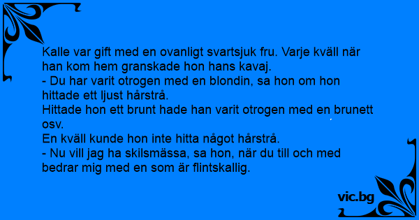 Kalle var gift med en ovanligt svartsjuk fru. Varje kväll när han kom hem granskade hon hans kavaj.