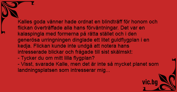 Kalles goda vänner hade ordnat en blindträff för honom och flickan överträffade alla hans förväntningar. Det var en kalaspingla med formerna på rätta stället och i den generösa urringningen dinglade ett litet guldflygplan i en kedja. Flickan kunde inte undgå att notera hans intresserade blickar och frågade till sist skälmskt: