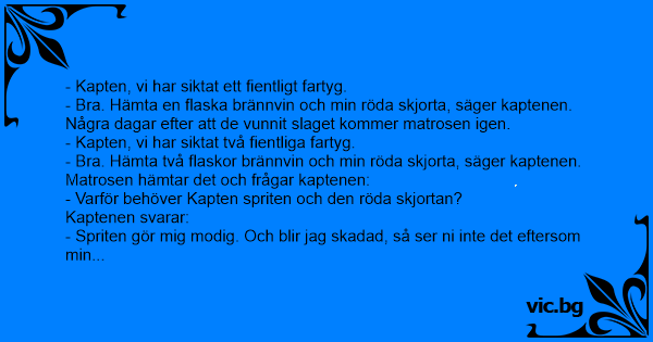 - Вrа. Hämta en flaska brännvin och min röda skjorta, säger kaptenen.