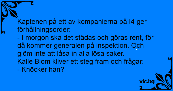 - I morgon ska det städas och göras rent, för då kommer generalen på inspektion. Och glöm inte att låsa in alla lösa saker.